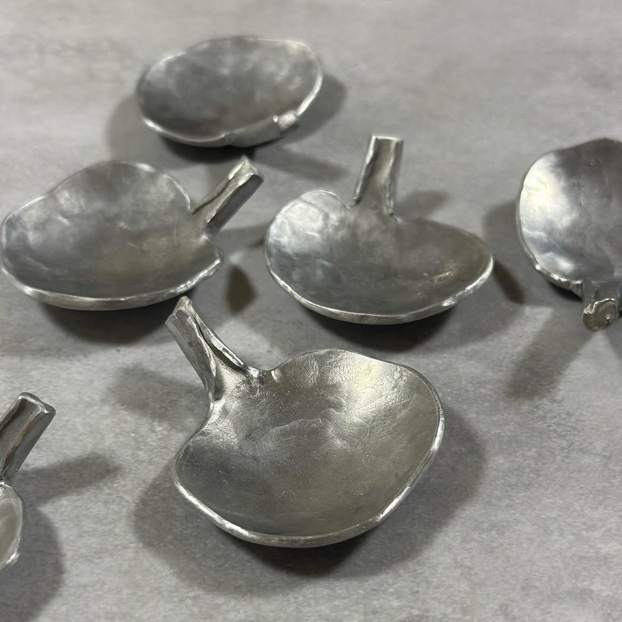 アルミを叩いた際に形成された形をそのままデザインとして活かしているため、一点ずつサイズ、形が異なります。予めご了承頂きますようお願い致します。