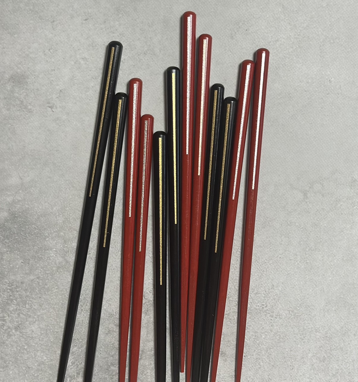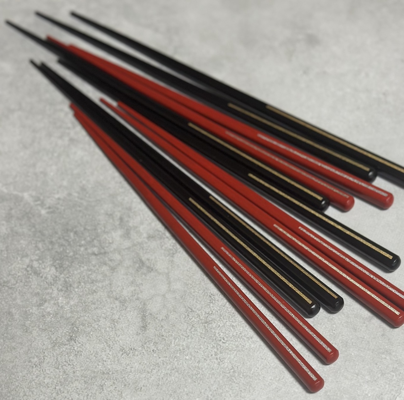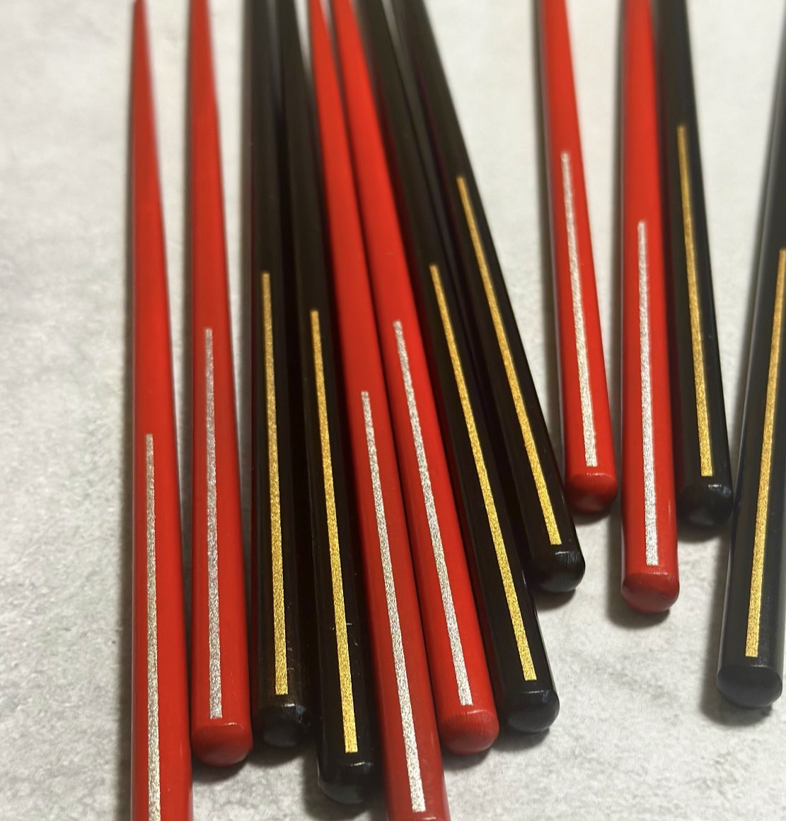 黒漆(男性用サイズ)、赤漆(女性用サイズ)にそれぞれ金と銀のラインが目を惹く先角の箸でございます。