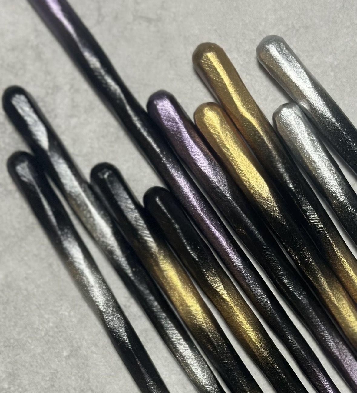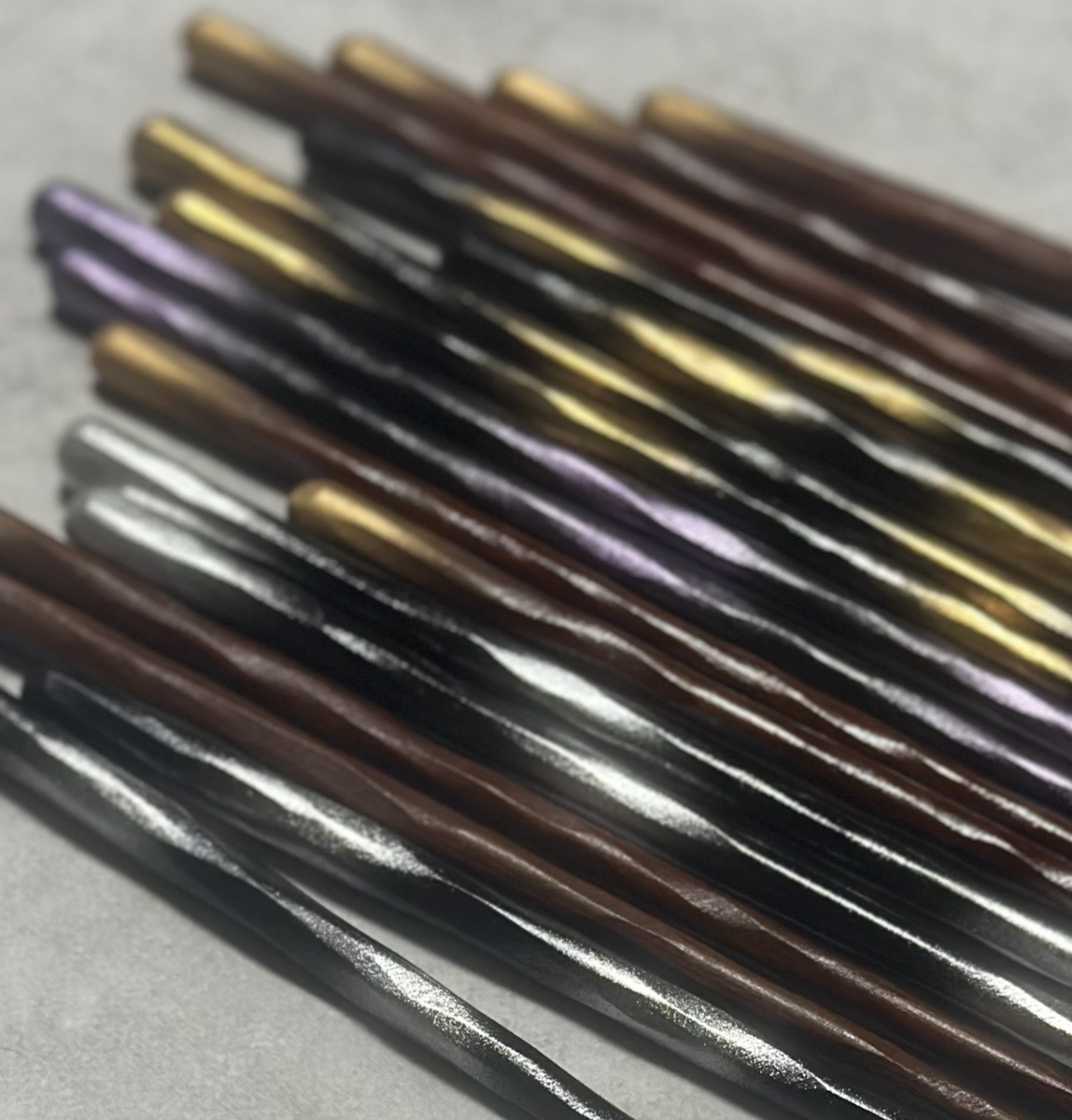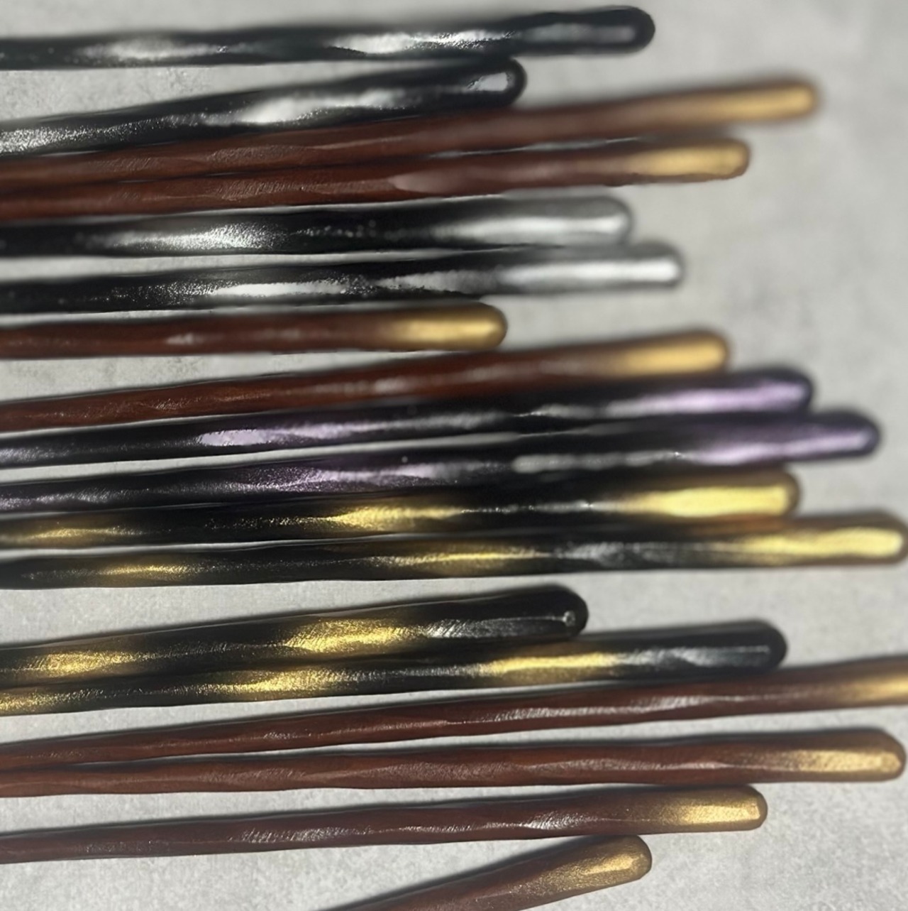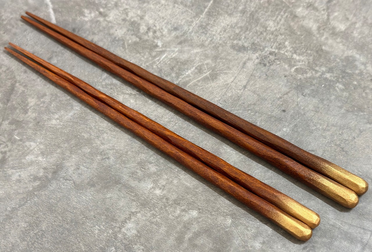 箸頭のみ金色のぼかしデザイン(持ち手から箸先まで茶色)のみ箸先が割り箸と同じ形状の四角いタイプ、